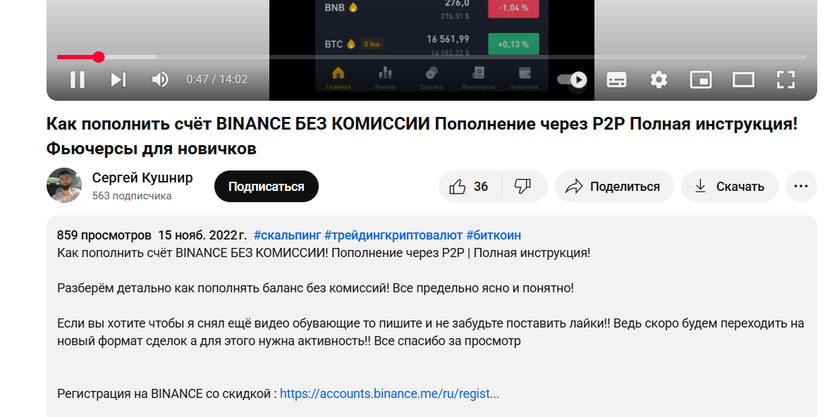 Торговые сигналы Кушнир не дает и платных услуг в своих видео не предлагает, но продвигает биржу Binance. В описании ко многим видео Сергея можно увидеть реферальную ссылку для регистрации на этой криптовалютной площадке. Очевидно, что он является ее партнером и зарабатывает деньги на привлечении рефералов.