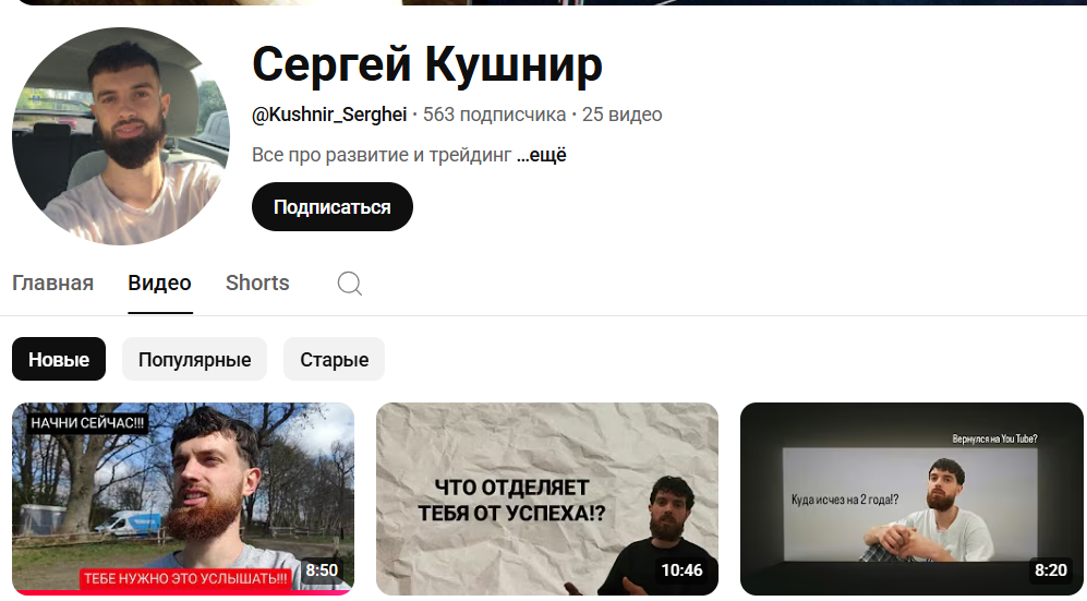 Сергей Кушнир представляет себя успешным трейдером. В этой области он работает более 3,5 лет. Специализируется на криптовалюте и фьючерсах. Судя по контенту его канала, торгует на бирже Binance. Сергей Кушнир не скрывает свою личность: называет свое имя и фамилию, записывает видеоролики с собственным участием. Но не делится историей становления, не приводит доказательств экспертности (диплом об окончании ВУЗа, сертификаты о прохождении курсов по трейдингу и т.п). В своих видео дает общие рекомендации, делится авторской стратегией и результатами сделок. Анализ комментариев показал, что он планировал начать проводить обучение и открыть канал в Телеграмм. Но прошло уже 2 года, а Кушнир так и не развил свой проект. На Ютубе за 3 года своей деятельности он выложил всего 25 видео и набрал чуть больше 560 подписчиков.