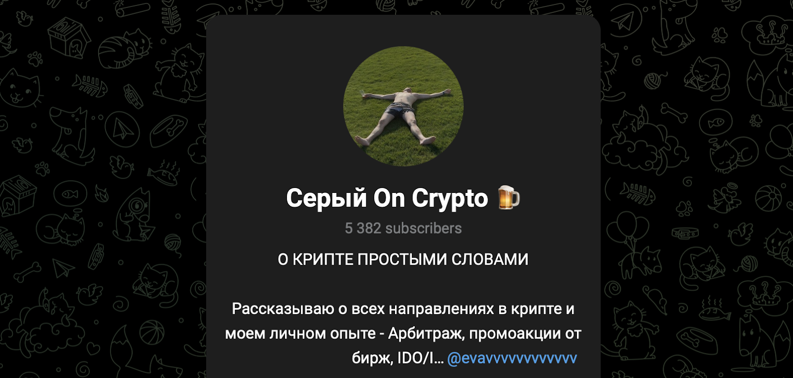 Как и полагается в крипто-сообществах, автор канала работает под псевдонимом и реального имени не называет. Персональные данные о владельце, равно как и документально подтвержденные результаты торговой деятельности, не раскрываются.