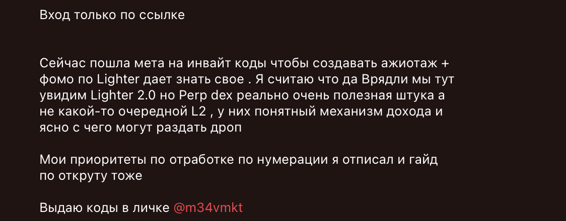 Самый скользкий момент — «коды», которые якобы раздаются в личные сообщения. Что это за коды, на каких условиях выдаются и насколько они рискованны, мы не знаем. Все условия их получения обсуждаются строго через директ, что вполне типично для скам-проектов. Такой подход удобен именно для манипуляций. В личных сообщениях легко менять условия, давить на срочность, обещать «индивидуальный подход» и создавать ощущение закрытого доступа.