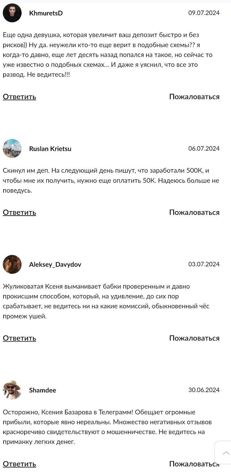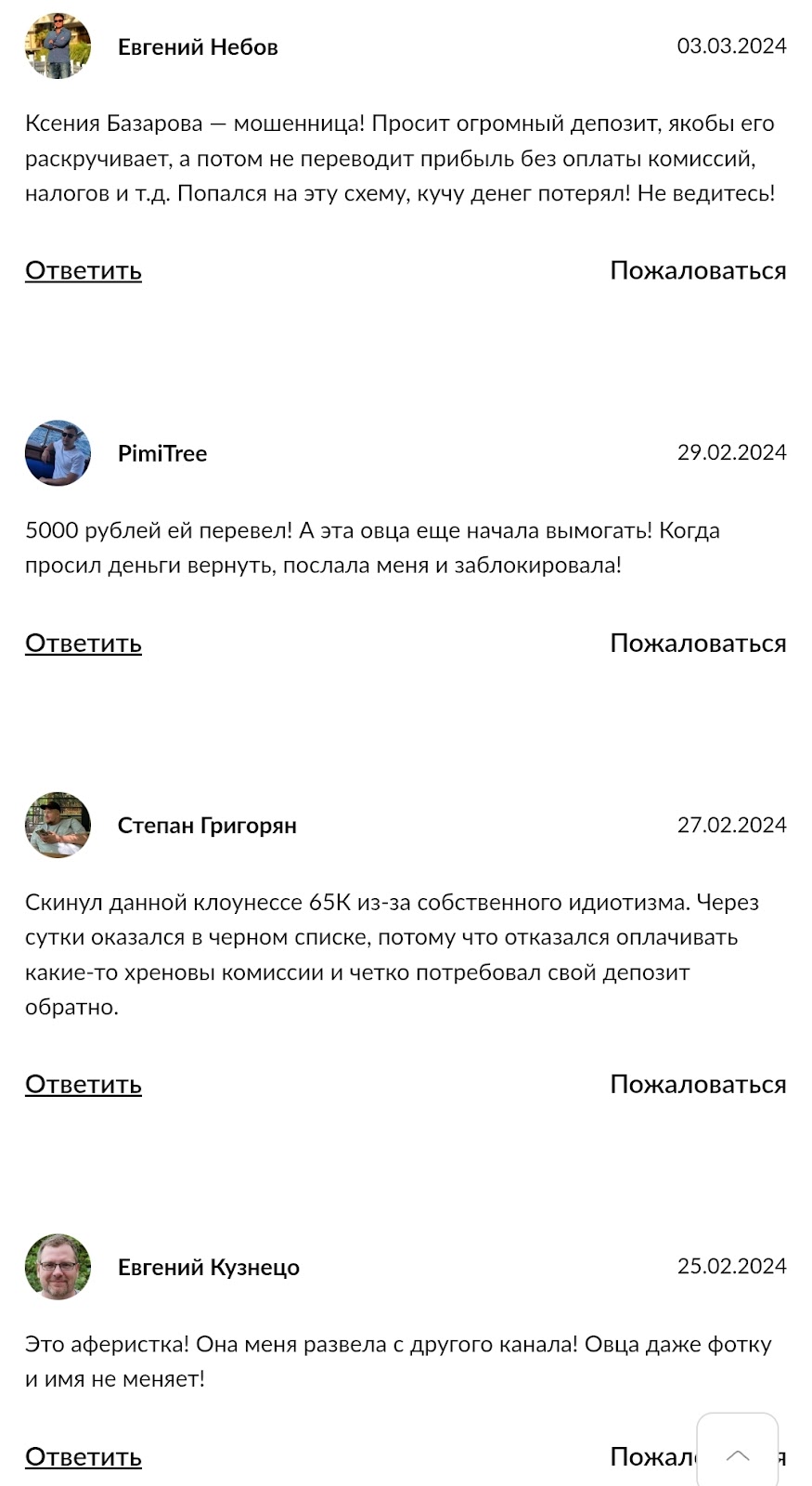 Все отзывы о Ксении Базаровой – Виктории носят негативный характер и подтверждают наши предположения о мошенничестве.