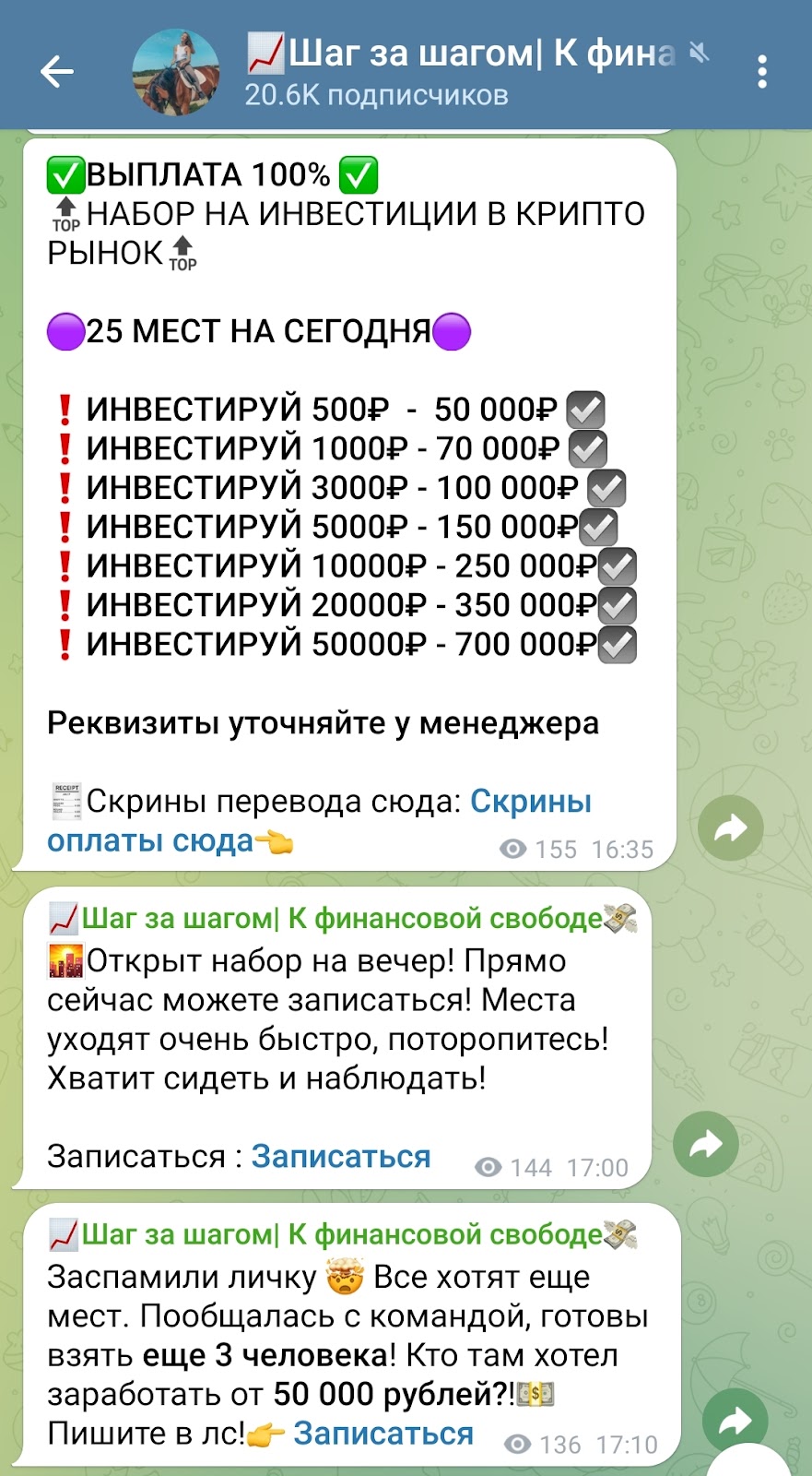Меньше чем за неделю администратор опубликовал почти 300 сообщений. На канал уже подписались больше 20 тысяч человек. Опытному инвестору этих фактов достаточно, чтобы сделать правильные выводы и не связываться с проектом.