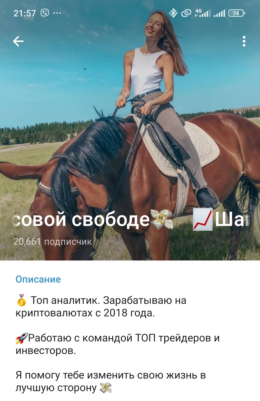 Автор канала представляется подписчикам Викторией. Она якобы криптотрейдер и топ-аналитик. За 10 лет работы на криптовалютном рынке Виктория заработала огромные деньги и разработала собственные высокодоходные стратегии инвестирования. В настоящее время блогерша занимается арбитражем криптовалют. В работе трейдеру помогает большая команда профессиональных аналитиков.