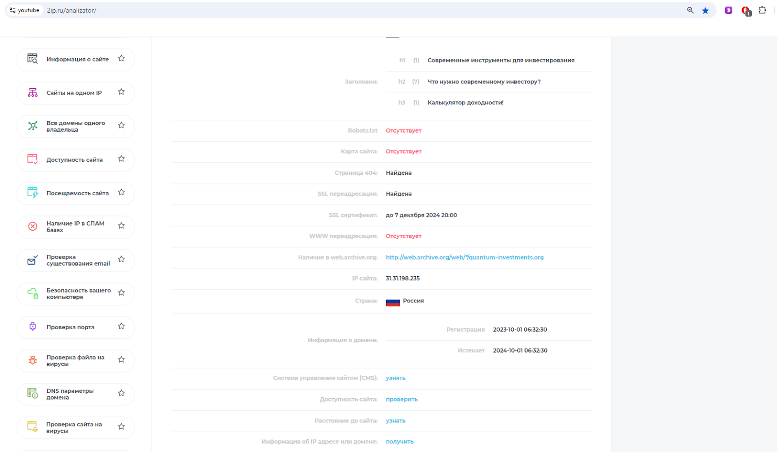 При проверке сайта, мы узнаем, что его дата регистрации далеко не 2018 год, а 2023. Он имеет маленький срок SSL-сертификата, который вот-вот закончится 7 декабря.