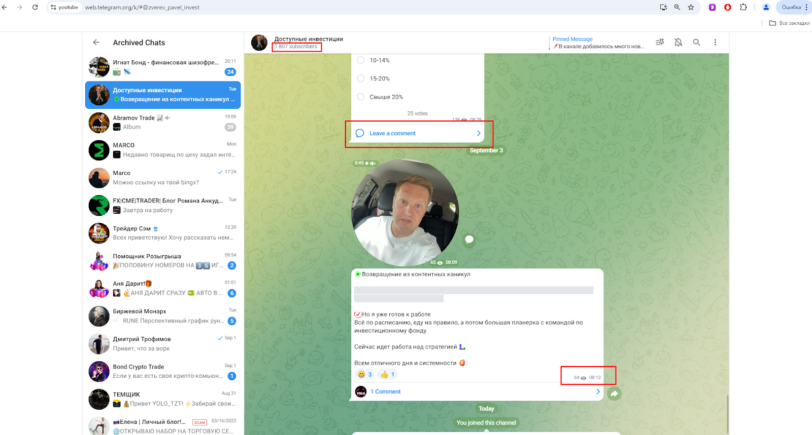 Посты, которые выкладывает Павел, это либо общение с подписчиками, которых в канале максимум 200-300 человек или публикация новых “общедоступных” материалов.Автор не рассказывает какой-то подтвержденной информации о команде, брокере, инвестиционном фонде. Также Павел не подтверждает свое состоянии, бизнес, лишь разбрасывается громкими словами..