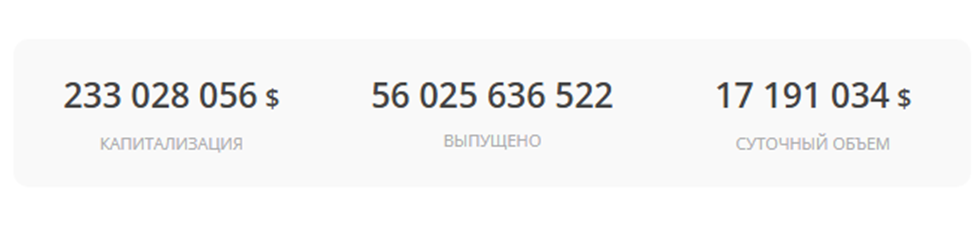 Всего выпущено 56025636522 монет, создавших капитализацию в 233 млн USD. Суточные торги находятся в пределах 17 млн USD, что упрощает инвестирование и продажу актива.