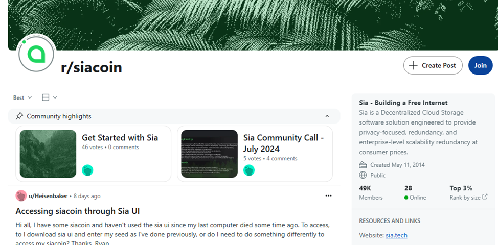 Самым большим сообществом, сформировавшемся вокруг децентрализованной платформы, считается официальная страница на Reddit. С 2014 года на адрес SiaCoin подписано более 44 тыс. последователей. Они активно создают новые темы для обсуждения, в том числе делятся личным мнением о перспективах инвестирования в «Сиакоин».