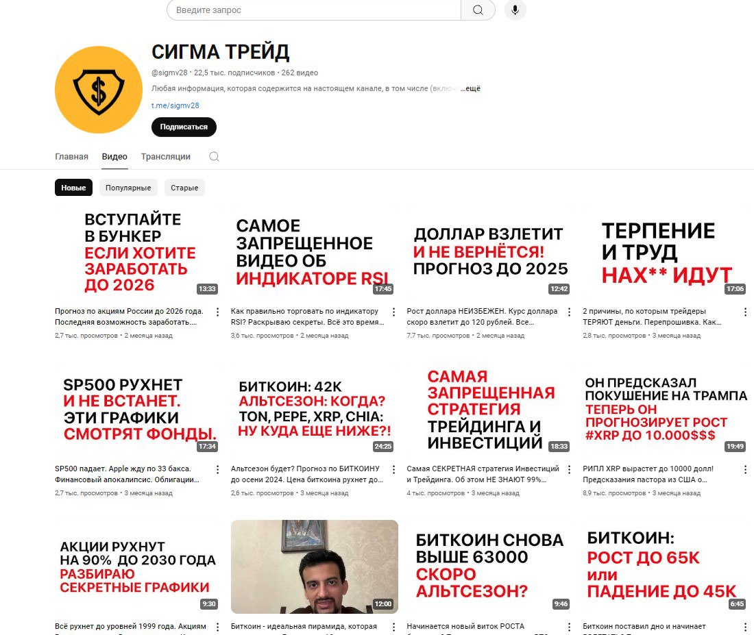 Трейдер Рафаэль Нагиев-Кобалович в ютуб-канале «Сигма Трейд» выкладывает ролики с бесплатной стратегией, графиками торгов и базовой аналитикой. Еще он активно приглашает на свой курс Sigmv28. Владелец канала постоянно предупреждает, что информация из видео — не инвестиционная рекомендация, а личное мнение автора. И люди, использующие эту информацию, действуют на свой страх и риск.