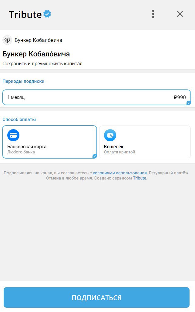 Стоимость членства в закрытой группе «Бункер Кобаловича» — 990 рублей в месяц по подписке.
