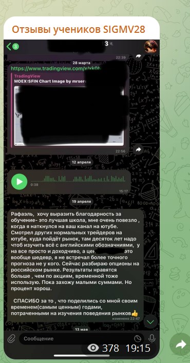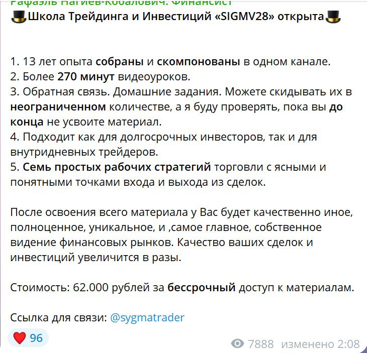 Еще трейдер зовет на обучение на курс «Школа трейдинга и инвестиций Sigmv28». По словам владельца канала, в закрытой группе с платным доступом собраны все его многолетние наработки. Он обещает демонстрировать свои настоящие системы и методы, рассказать, как торговать и совершать сделки на бирже, чтобы выйти в плюс.