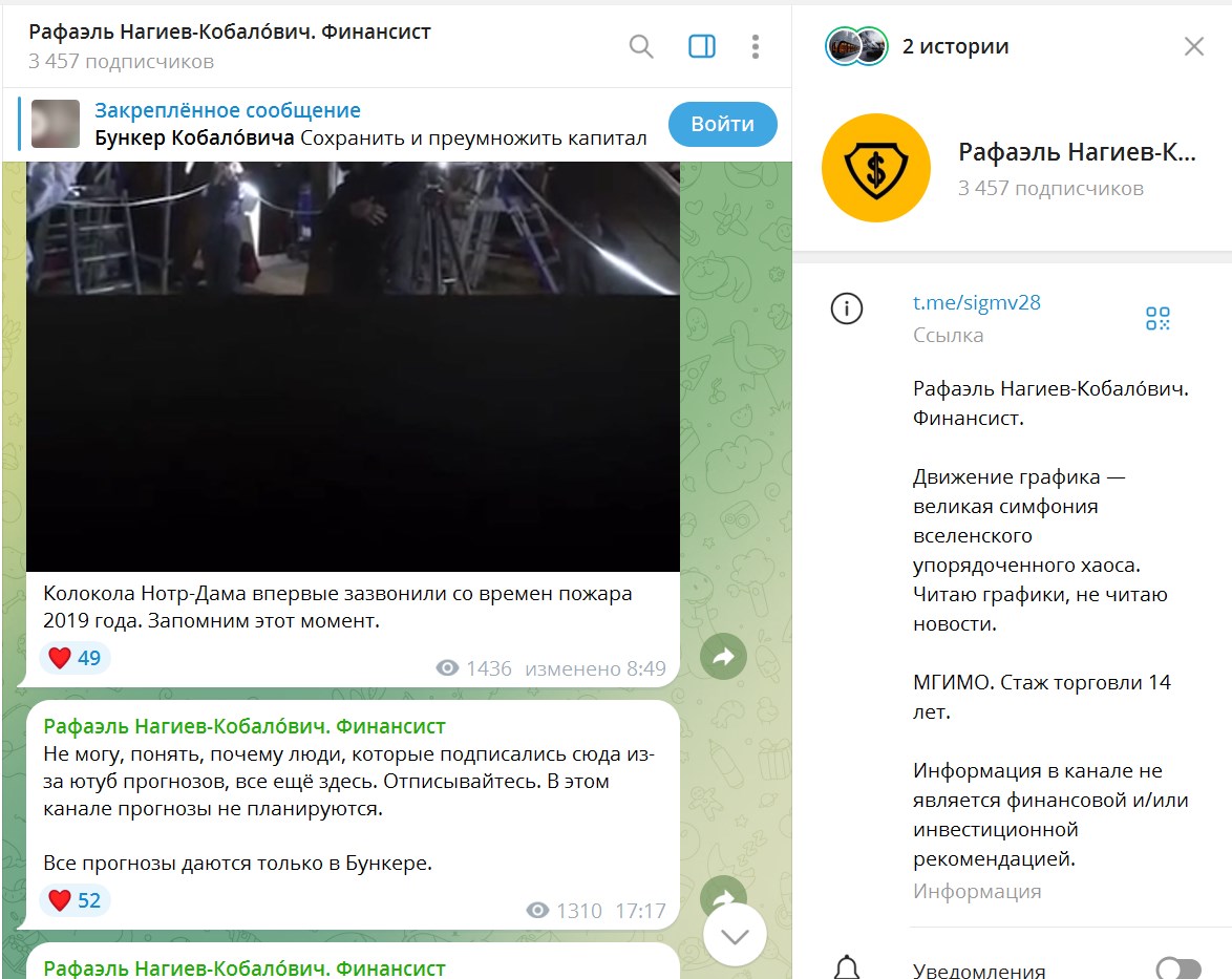 Основную деятельность трейдер ведет в телеграмм-канале Sigmv28. Там он постит мотивирующие тексты, общеизвестные политические и финансовые новости. Но в основном владелец канала приглашает в платный закрытый канал «Бункер Кобаловича». Там он обещает давать подробные прогнозы, обзоры и аналитику, которые помогут покупать и продавать, чтобы заработать.