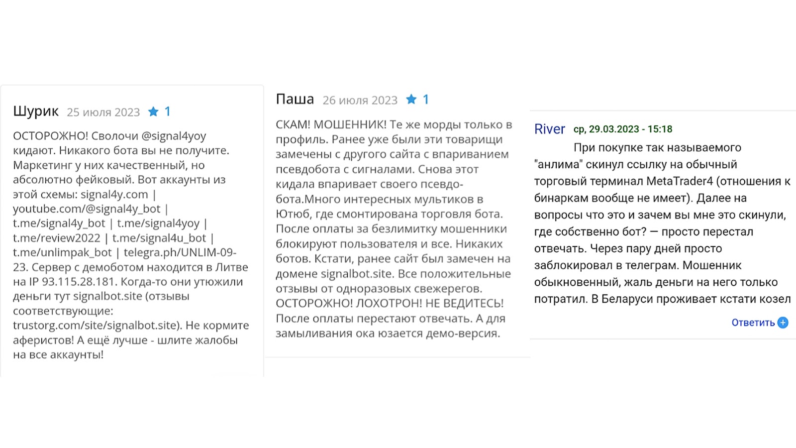 Создатели выкладывают положительные отзывы о Signal4y com bot. Такие высказывания выглядят фейковыми, так как в интернете есть противоположные. По словам бывших клиентов, основатели являются мошенниками.