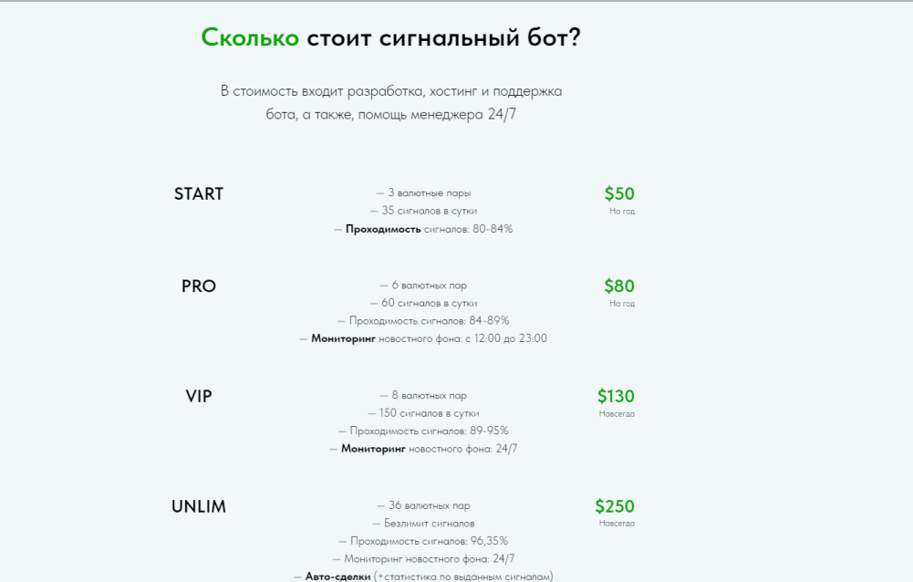 - UNLIM — нет ограничений в сигналах. Их проходимость до 96.35%. Вечный доступ обойдется в 250 долларов