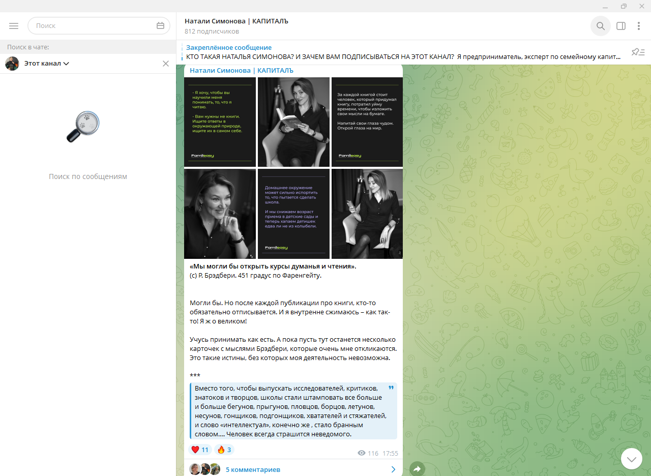 Фишка проекта — тесное комьюнити, где участники могут обсуждать книги, делиться личным опытом и участвовать в диалогах о жизни, наследии и финансах. Вся работа выстроена вокруг администратора Натальи, которая ранее работала через аккаунт Simonova Prowealth. Она позиционирует себя как эксперта с большим опытом в финансах, планировании и семейном консультировании, правда, официальных подтверждений этим словам в открытых источниках нет.