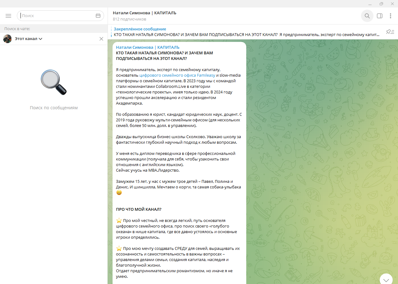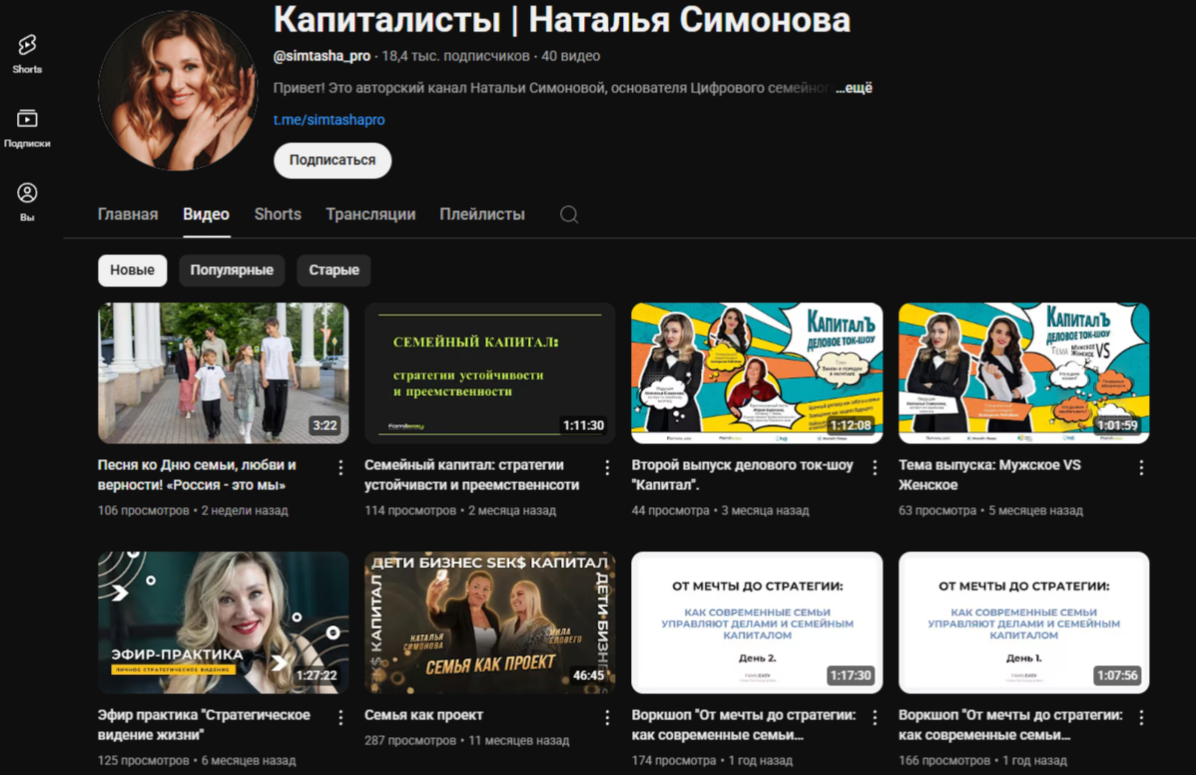 На канале заявлено, что Наталья Симонова является основателем цифрового семейного офиса Famileasy ru, а также владеет ютуб-каналом Simtasha pro с 18 000 участников. Тем не менее ресурс, указанный в описании паблика, уже не работает, а медиа-контент просматривают от 50 до 250 человек.