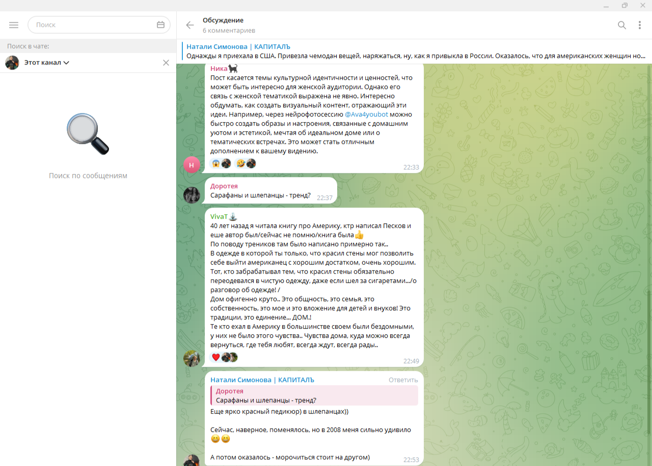 Канал Simtashapro был создан в 2020 году и на лето 2025 года в нём находится более 800 участников. Комментарии в паблике открыты, а согласно Tg Stat вовлечённость подписчиков выше среднего. Большинство тем на канале Simtasha нацелена на женскую аудиторию, причем акцент делается на саморазвитие, культурные ценности и идеи о семейном благополучии.