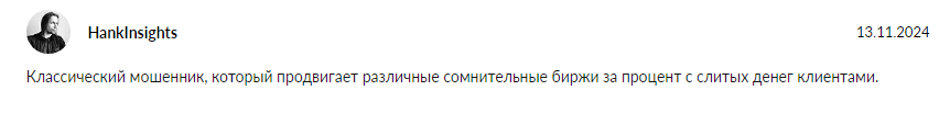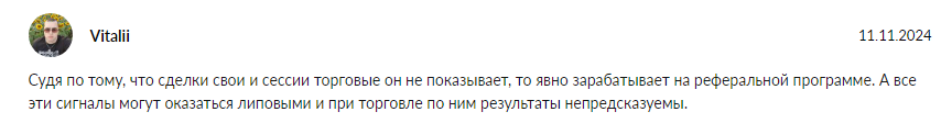 В других отзывах пишут, что Даня не демонстрирует результаты собственных сделок. Инвесторы говорят, что его сигналы не дают никакой прибыли.