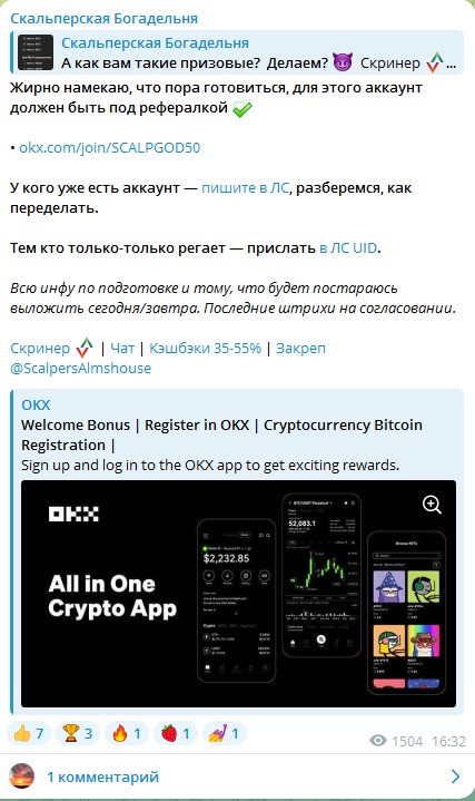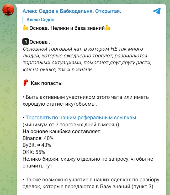 Контент ресурса шаблонный многим другим проектам, которые предлагают сигналы и рекомендации. Админ под ником Sedov Alex периодически публикует некоторую аналитику рынка, ее очень мало, и дает рекомендации по скальпингу. В большей степени содержание канала состоит из приглашений к сотрудничеству и навязываний пользователям подписки на различные биржи по реферальным ссылкам. В числе таких платформ: OKX, Bybit, Gate, Bitget, Mexc, BingX и другие. То есть подписка на биржи — это главное условие сотрудничества. А значит, мошенник @ SedovAlex зарабатывает на рефералах.