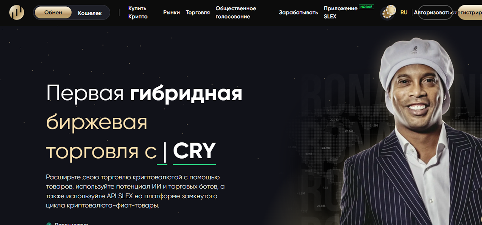 Данные о команде представлены в разделе с информацией о бирже. Сказано, что миссия централизованной площадки Slex – сделать торговлю криптовалютами более демократичной и доступной для других людей. Примечательно, что официальным амбассадором биржи является известный футболист Рональдиньо.