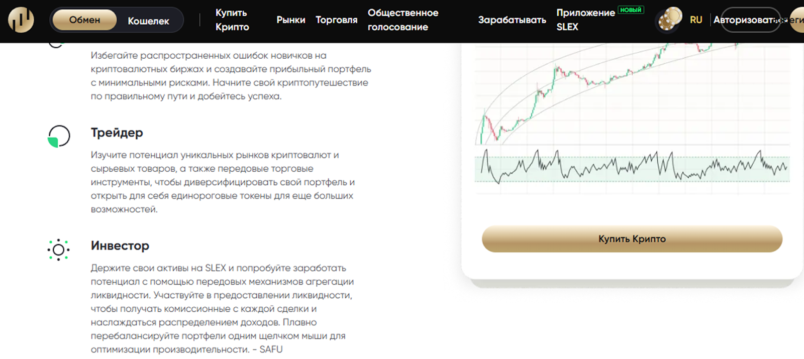 Обмен на Slex io долгое время был основной услугой. Но спустя некоторое время перечень услуг расширился. Торговые тарифы разделены по уровню подготовки и стилю трейдинга.