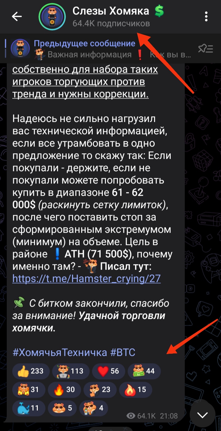 Контент канала «Слезы Хомяка» в основном сосредоточен на популярной в тг тапалке Hamster Kombat. Помимо этого владелец постит рекомендации по трейдингу. Например, есть посты про конкретные ценовые уровни для входа в позицию, установки стоп-лоссов и целевых уровней прибыли. Огромный плюс — автор канала не продвигает свои или сторонние платные курсы и не призывает никого куда-либо инвестировать. Он делится собственными наблюдениями и делает это бесплатно. Это отличает «Слезы Хомяка» от многих других проектов, где часто можно встретить агрессивную рекламу и призывы вложить деньги во что-то.