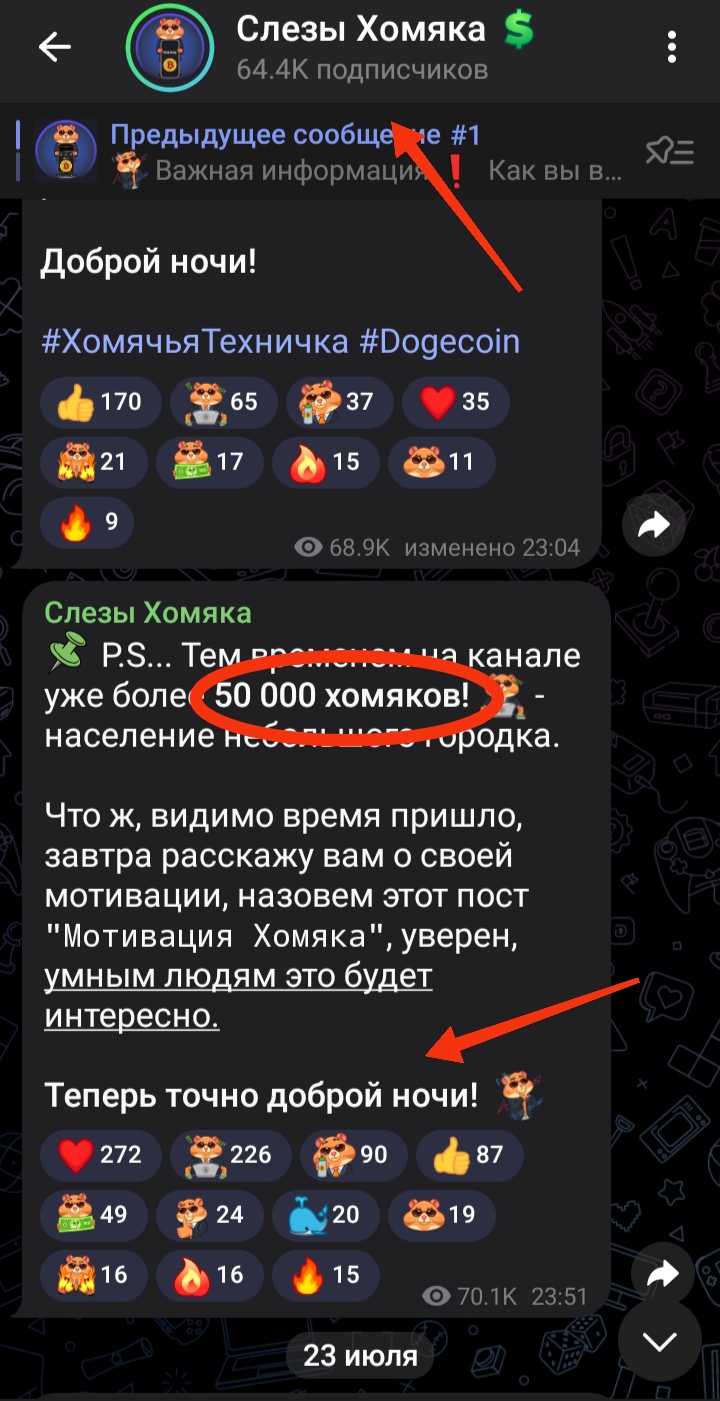 На 25 июля 2024 у телеграмм-канала «Слезы Хомяка» 64.4 тысячи подписчиков. С учетом того, что канал специализированный, цифра достаточно внушительная. Количество просмотров под постами совпадает с числом подписчиков. Она варьируется от 64 до 70 тысяч. Это дает четко понять, что аудитория действительно интересуется контентом.