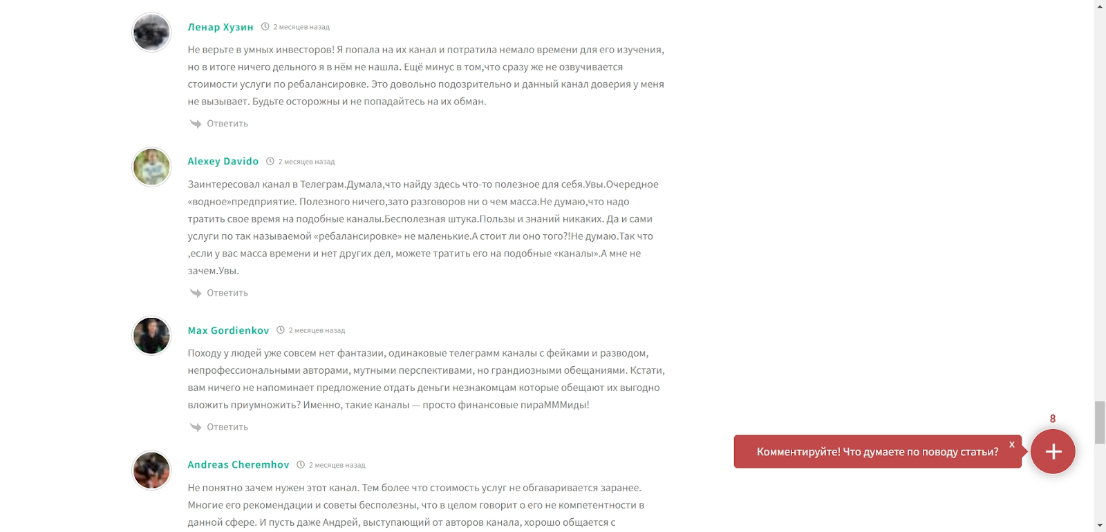 Также бывшие подписчики недовольны качеством бесплатных материалов и сомневаются в экспертности авторов. Распространенное мнение, что написанному в канале верить нельзя и полезной информации здесь на самом деле немного.