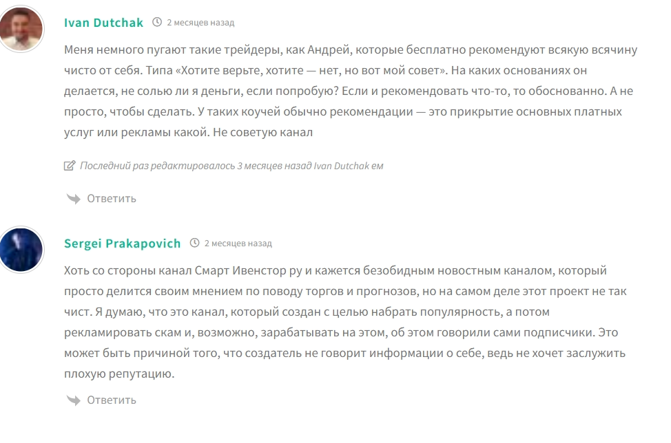 О Смарт Инвестор ТГ в интернете есть положительные отзывы, но больше отрицательных. Негативные реакции и возмущенные рассказы касаются платных услуг, стоимость которых не называют в открытую.