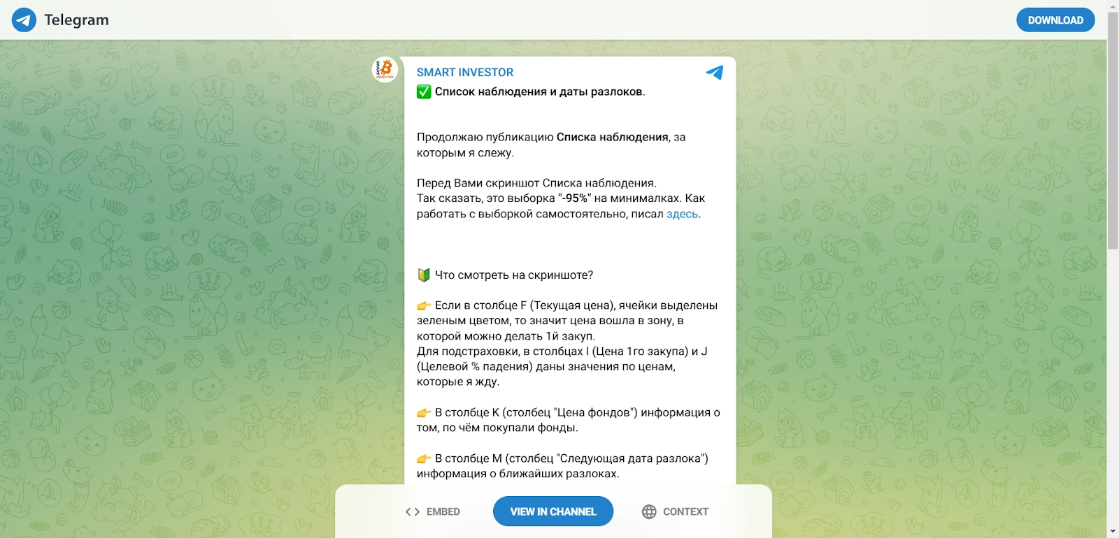 Людям, которые мечтают покупать, продавать крипту и зарабатывать на этом, часто не хватает системы. Админ, поделившись базовыми знаниями в бесплатном канале, показав графики, в которых можно запутаться, теперь дает готовое решение, как формировать портфель. Стоимость платных услуг в канале мы не нашли.Обзор социальных сетей Смарт Инвестор Телеграмм