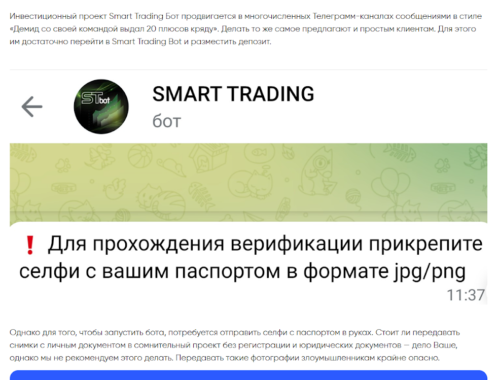 Для того, чтобы начать работу с ботом smarttradingclub bot, необходимо пройти регистрацию. Запрашивается фотография клиента с его паспортом. Отправлять фотографии с личными данными организациями, которые не предъявляют своих юридических документов, не стоит. Также просят указать базовые пункты.