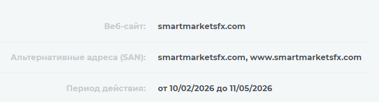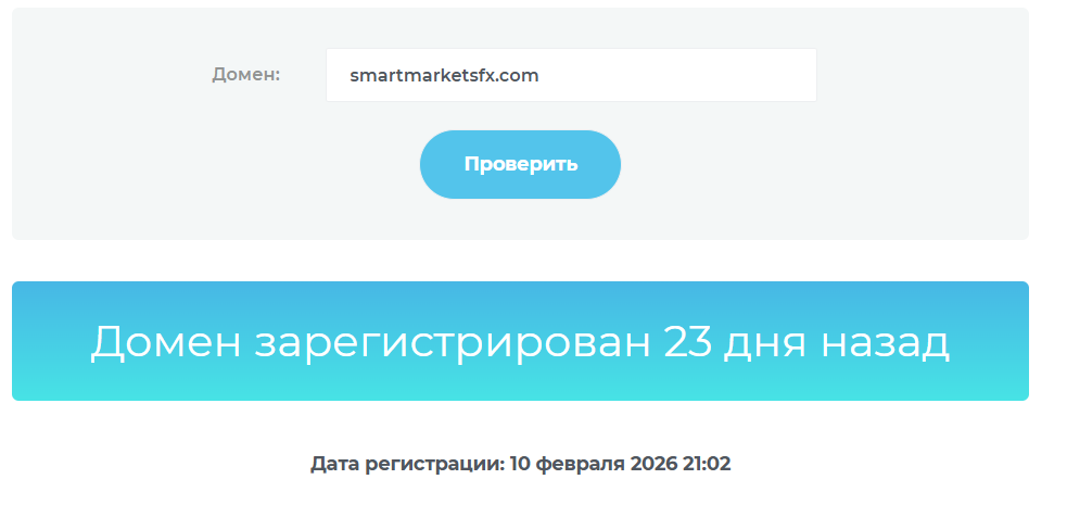Сайт SmartMarkets FX представляет собой простой одностраничник. Проверка показала, что он был зарегистрирован меньше месяца назад — 10 февраля 2026 года. При этом на самой площадке заявлено о работе с 2025 года. Завышение срока деятельности характерно для недобросовестных проектов. Так они пытаются создать видимость надежной и стабильной компании.