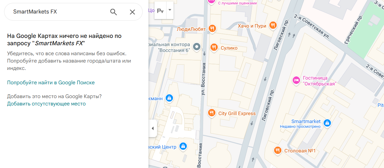 В ходе анализа сайта биржи не было найдено лицензии и регистрационного номера. На платформе есть раздел о компании, но в нем не приведены имена разработчиков и название фирмы-владельца. Юридический адрес на сайте не указан. На Гугл картах SmartMarkets найти не удалось. Все это указывает на нелегальную деятельность биржи.