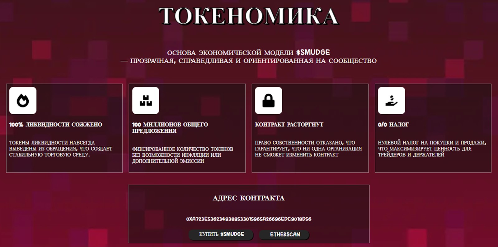 Токеномика Smudge OnEth тоже довольно проста. Размер эмиссии – 100 миллионов монет, сто процентов ликвидности было сожжено. Контракт находится в открытом доступе – так разработчики стремятся доказать прозрачность проекта.