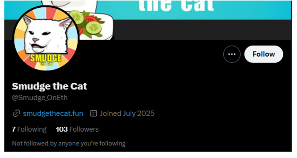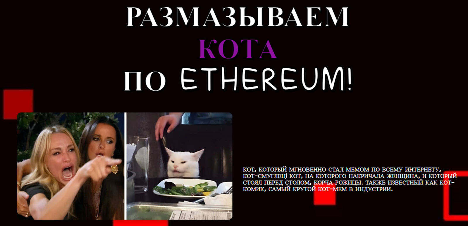 За основу мем-коина взята картинка Woman yelling at a cat, которая стала вирусной в соцсетях. На сайте представлено несколько фантазийных мемов на данную тематику, но их немного. К слову, проект выглядит весьма топорно. Заметно, что над дизайном особо не старались и он давно не обновлялся. Примечательно, что периодически основной сайт блокируется и пользователям предложено воспользоваться зеркалом Smudgethecat fun.