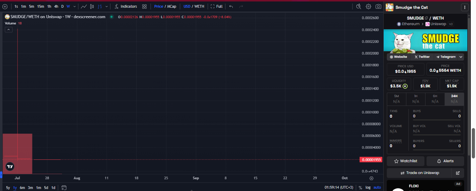 Smudge cat – монета, которая торгуется только на бирже Uniswap. Купить токен можно только через мост с Эфиром. Биржевой график монеты выглядит не очень вдохновляюще.
