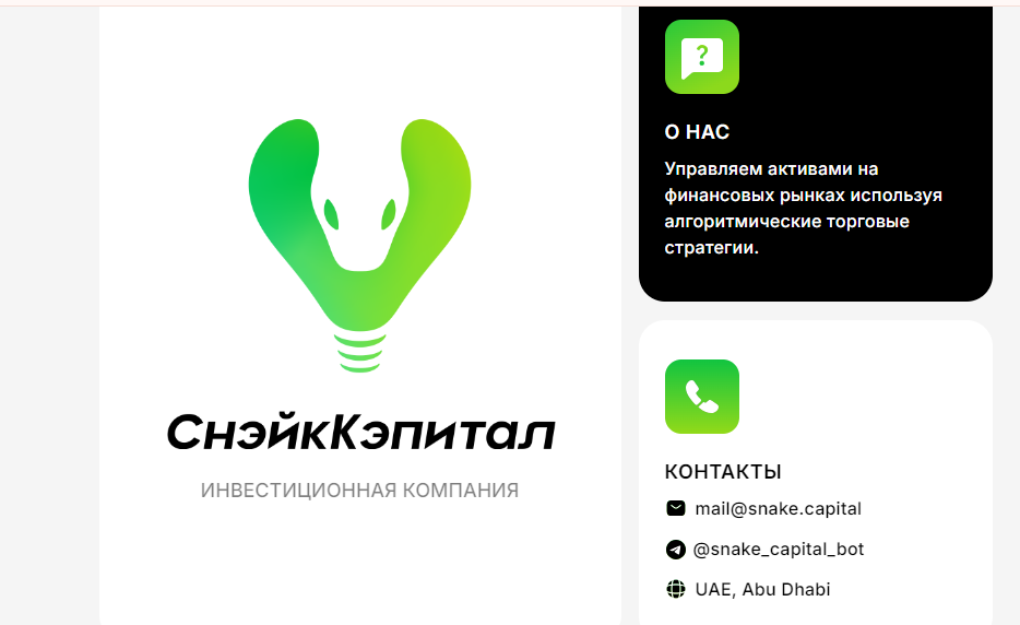 Сайт инвестиционного фонда Snake Capital – это примитивный одностраничный на Tilda, который содержит только одну фразу: «Управляем активами на финансовых рынках используя алгоритмические торговые стратегии». Видимо Петлюк считает, что этого долго хватить клиентам, чтобы перевести ему деньги. Никакой лицензии или разрешительных документов у этого проекта нет.