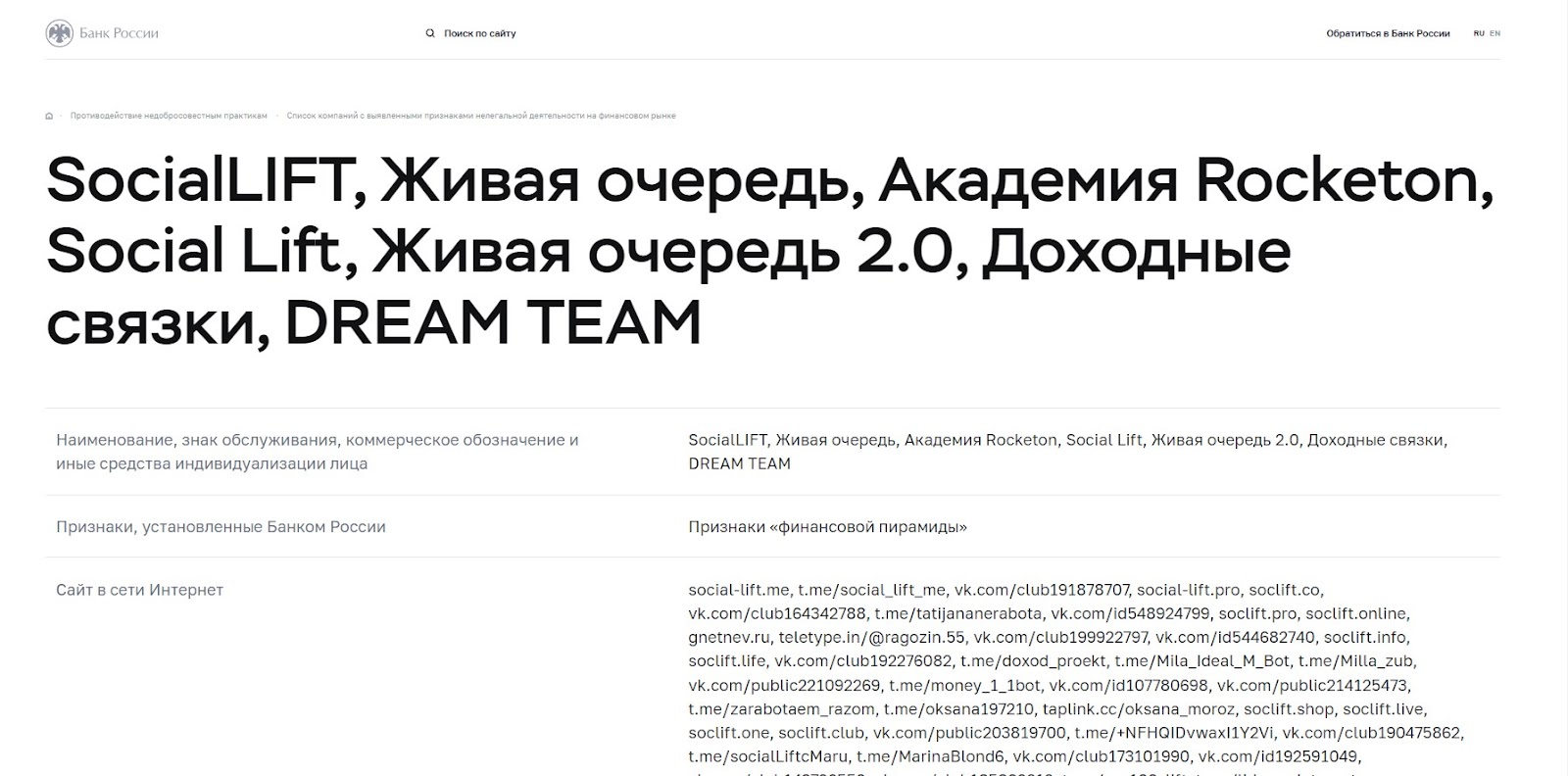 Все официальные сайты этого проекта заблокированы ЦБ РФ. Центральный Банк решил, что под признаки финансовой пирамиды подпадают все действия платформы «SocialLift Живая очередь».