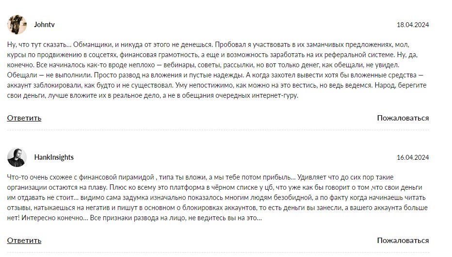 - все сайты проекта регулятор заблокировал как финансовую пирамиду, что говорит о явном разводе людей на деньги;