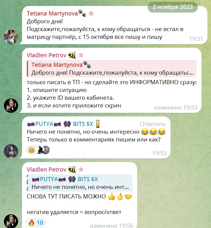 Люди спрашивают об особенностях проекта, а потом все пишут, что вообще не могут зайти на сайт. Но отзывы довольных клиентов на канале тоже не демонстрируют, как и статистику дохода.