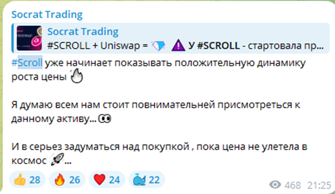 Стоит отметить, что Scroll, который так активно пиарится на Socrat trade действительно торгуется на нескольких биржах. Но ликвидность монеты нулевая. Это значит, что купить ее можно, а вот продать нет. Хотя мошенник Socrat trading активно убеждает свою аудиторию в обратном. При этом никаких доказательств того, что сам является держателем токена и участвует в предстоящем дропе не демонстрирует. К слову, статистики, подтверждающей, что перед нами опытный инвестор, тоже нет. Это доказывает, что рекомендации мужчины носят самую высокую степень риска для инвесторов и следовать им не стоит.Отзывы на Socrat trading