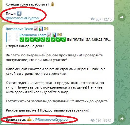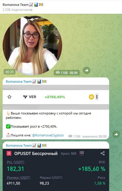 Телеграм-канал Romanova Team — частный коммерческий проект для привлечения инвестиций. Софи уверяет, что транши от клиентов позволяют ей на практике реализовывать схему работы Pump&Dump на криптовалютных биржах, в 10-15 раз увеличивать вложенные депозиты всего за 3-48 часов.