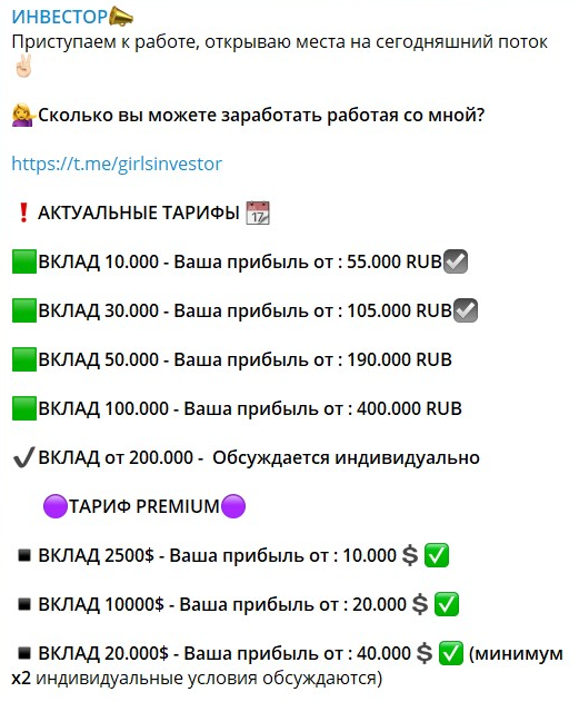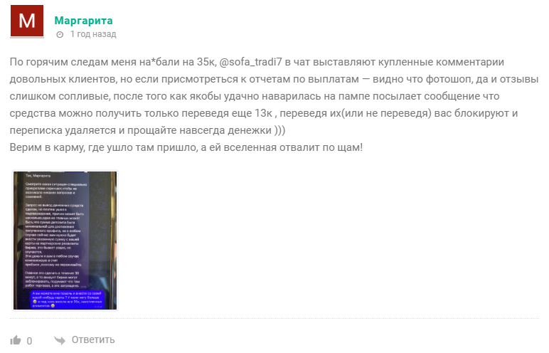 Условия же “выгодного инвестирования”, как оказалось, представляют собой типичные обещания проектов по раскрутке депозитов, которые в большинстве своем мошеннические. “Сказочных” сотен тысяч рублей с 500 тут не предлагают, однако даже прибыль в 55 тыс. рублей при вложении всего в 10 тыс. кажется абсолютно нереалистичной. Еще и стоит учитывать, что все это трейдер Sofya BitmamaS обещает “провернуть” менее чем за день.