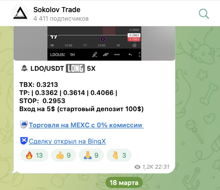 На ТГК Sokolov Trade, находящийся по URL t me tradebysokolov, на 22 марта 2026-го года, подписаны 4,4 тысячи юзеров. Сообщения в его ленте получают по 1-1,5 тыс показов и 15-30 реакций. Функция комментирования отключена.
