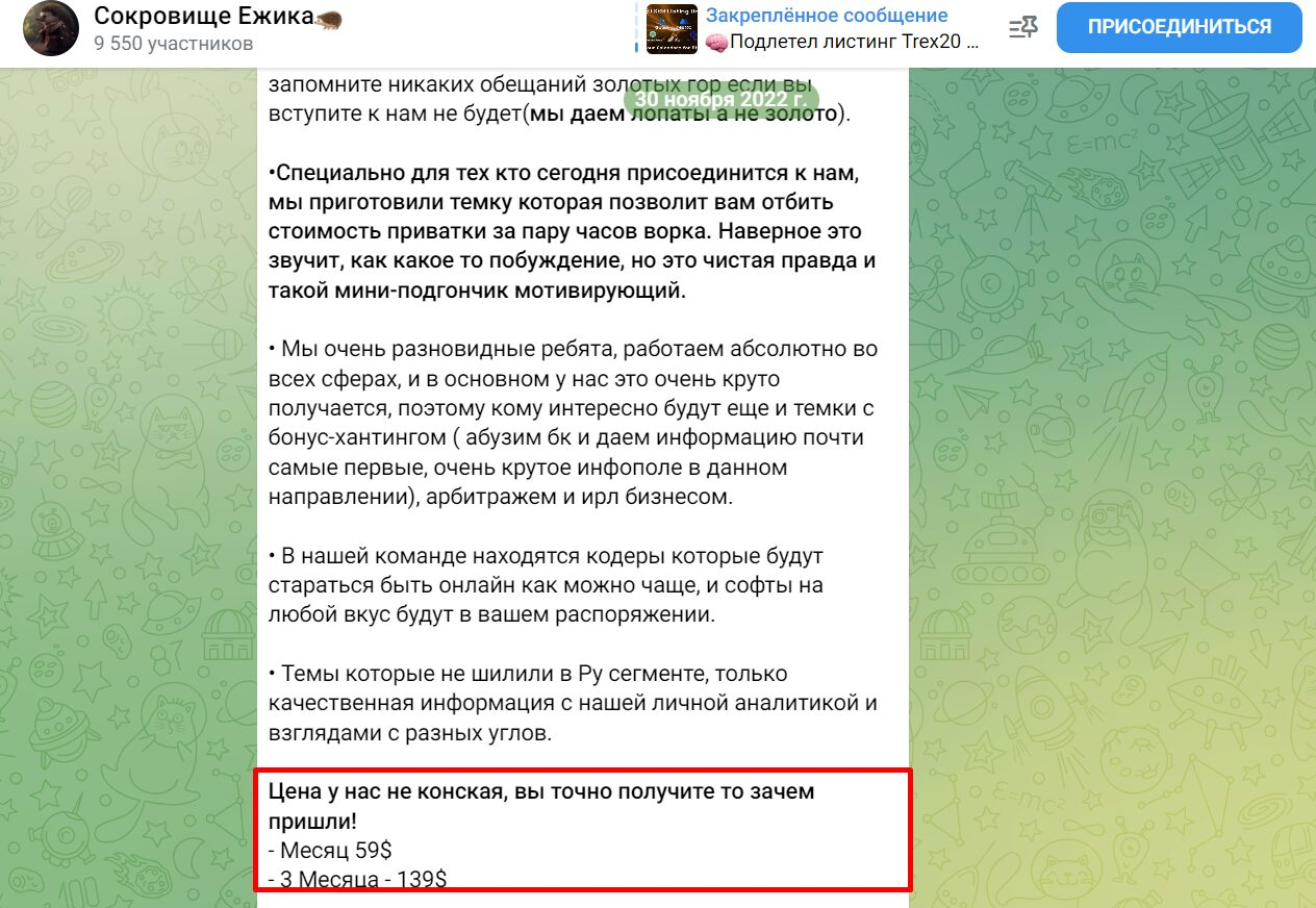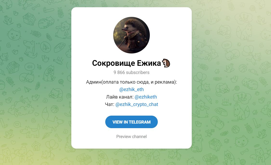 «Сокровище ежика» – это телеграмм-канал анонимного трейдера, который позиционирует себя успешным и известным на финансовом рынке. Админ предлагает помощь в обучении по фармингу криптовалют. Автор Ezhiketh часто оставляет ссылки на сторонние ресурсы – рекомендует использовать торговые инструменты, которые позволят заработать в больший плюс. Большая часть контента бесплатная. Но на канале продвигаются и платные услуги. Это покупка доступа к закрытому каналу с сигналами для прибыльной торговли.