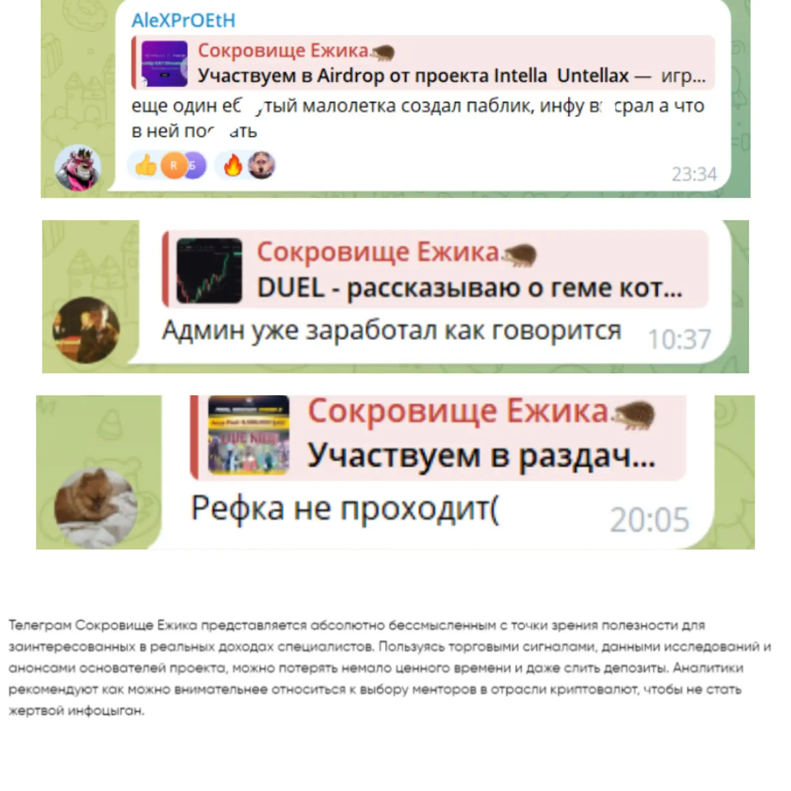 - анонимность автора, отсутствие лицензии, исчерпывающей статистики – подписчики «Сокровище ежика» рискуют доверить свои деньги тому, кто на самом деле может оказаться рассекреченным мошенником;