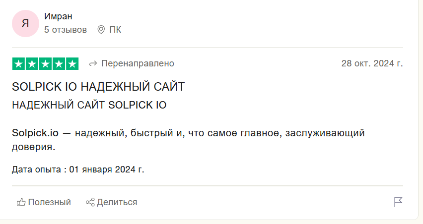О Solpick Io отзывы в интернете есть и отрицательные, и положительные. Довольные клиенты, которые заключали сделки в компании, пишут, что она работает честно. Сайт заслуживает доверия, техподдержка отвечает на их вопросы.
