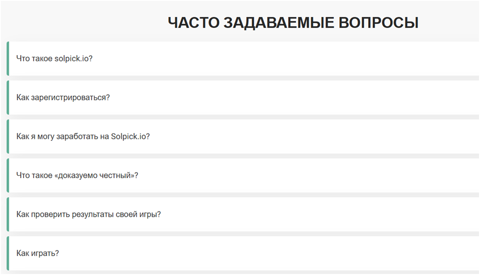 Чуть ниже мы видим меню с часто задаваемыми вопросами, где клиенты могут вкратце ознакомиться с сервисом. Например, здесь рассказывается, что Solpick io — это бесплатный кран Sol. Также можно узнать, как пройти регистрацию и приступить к работе, внести депозит, вывести деньги, сколько можно заработать на партнерах и т.д.