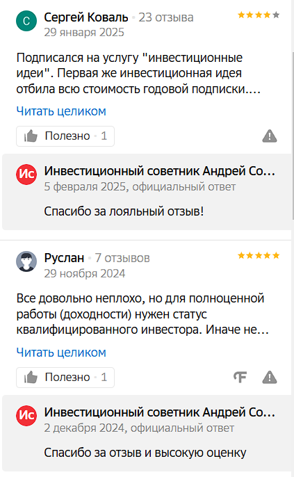 Мы рекомендуем финансового советника Андрея Соколова. Инвестор получил лицензию и работает по договору. Большое количество положительных отзывов в сети и отсутствие отрицательных повышают доверие.