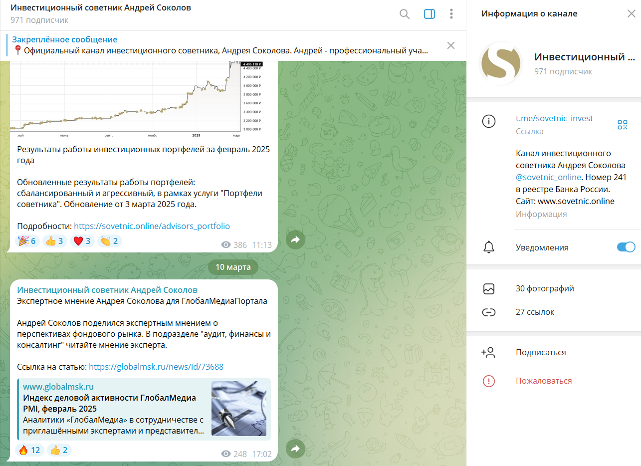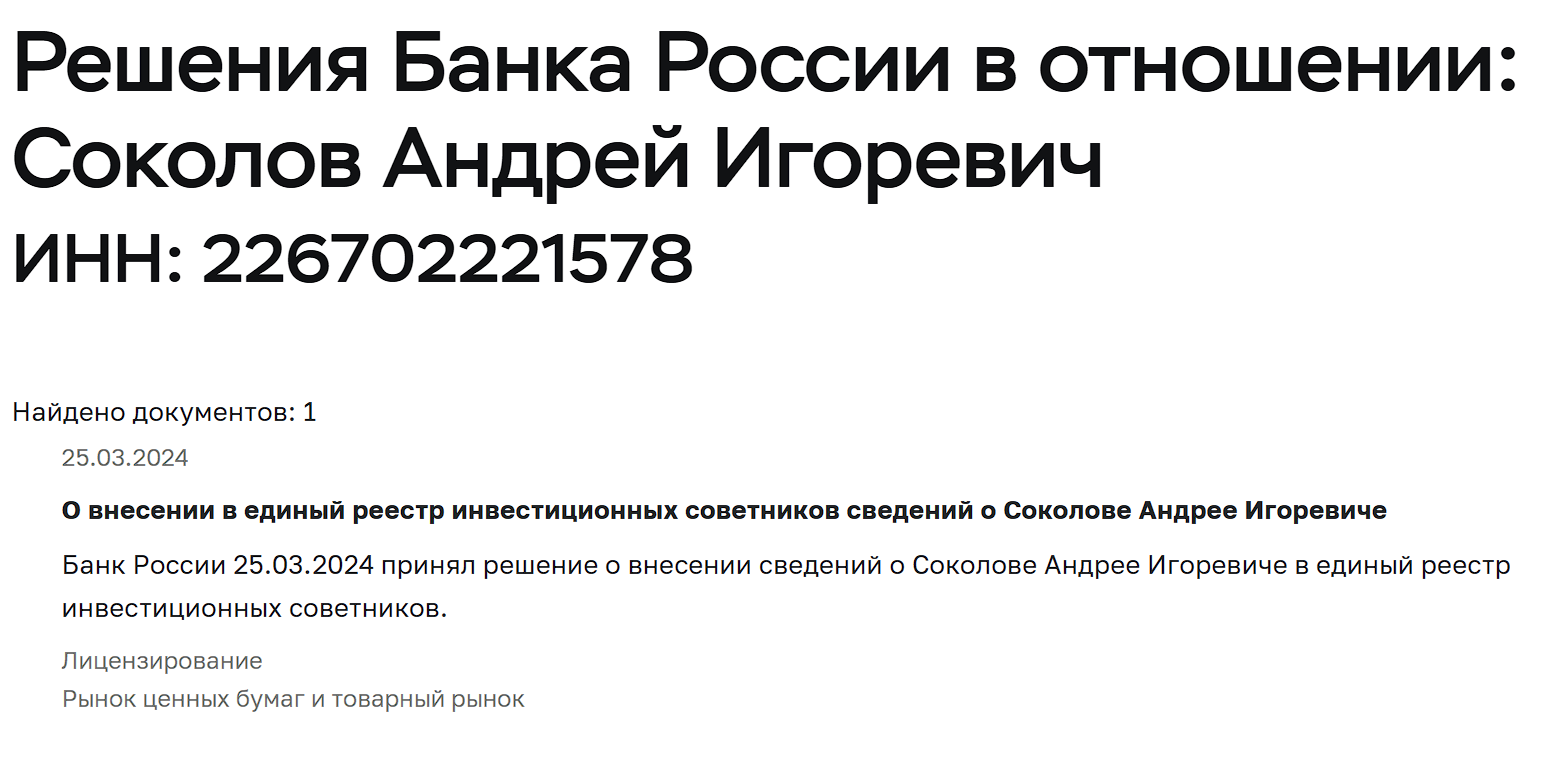 Инвестиционный советник Андрей Соколов утверждает, что работает уже 16 лет. На сайте sovetnic.online он оставялет ссылку на регистрацию в реестре Центробанка. Предприниматель ИП Соколов Андрей Игоревич отмечен на сайте cbr.ru под номером 241 25 марта 2024 года.