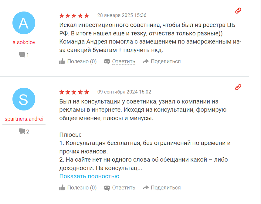 На платформе yell.ru есть 2 хороших отзыва. В них клиенты отмечают профессионализм советника и большое количество бесплатных консультаций. В качестве минусов называют завышенное требование к капиталу и широкий список бумаг для заключения договора.